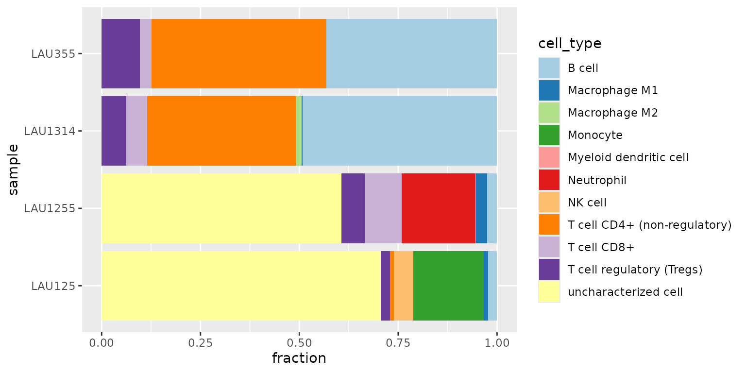 Estimating the amount of “uncharacterized cells” is a novel feature introduced by quanTIseq and EPIC Finotello et al. (2019). This estimate often corresponds to the fraction of tumor cells in the sample.