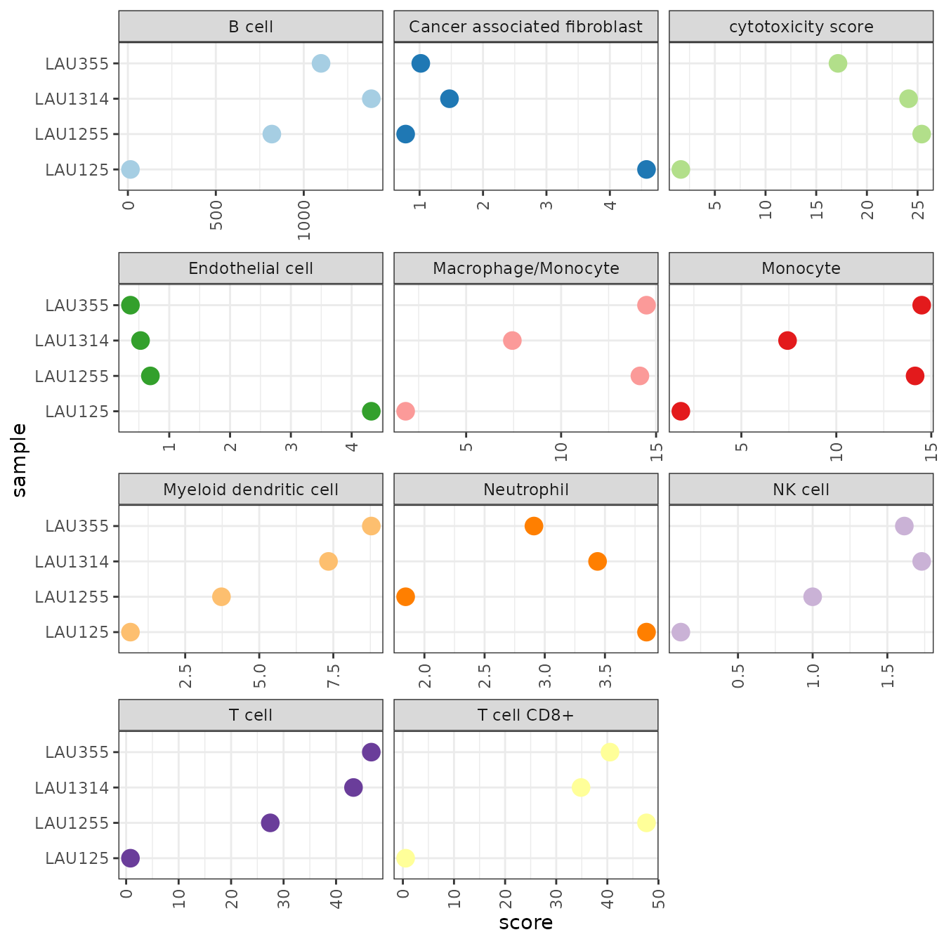 With the scores being in arbitrary units, the results are not useful for judging if a cell type is present in the sample, or not. However, we can compare the relative values between samples and relate them to the results we obtained earlier using quanTIseq.